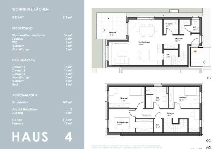 Die kompakt geplanten Häuser erstrecken sich über 2 Geschosse und bieten auf ca. 102 m² - im Mittelhaus - sowie 119 m² Wohnfläche viel Platz für die ganze Familie.