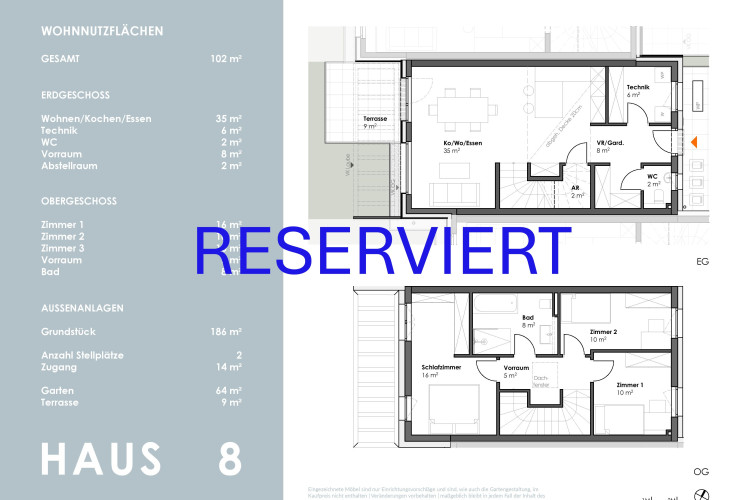 Die kompakt geplanten Häuser erstrecken sich über 2 Geschosse und bieten auf ca. 102 m² - im Mittelhaus - sowie 119 m² Wohnfläche viel Platz für die ganze Familie.