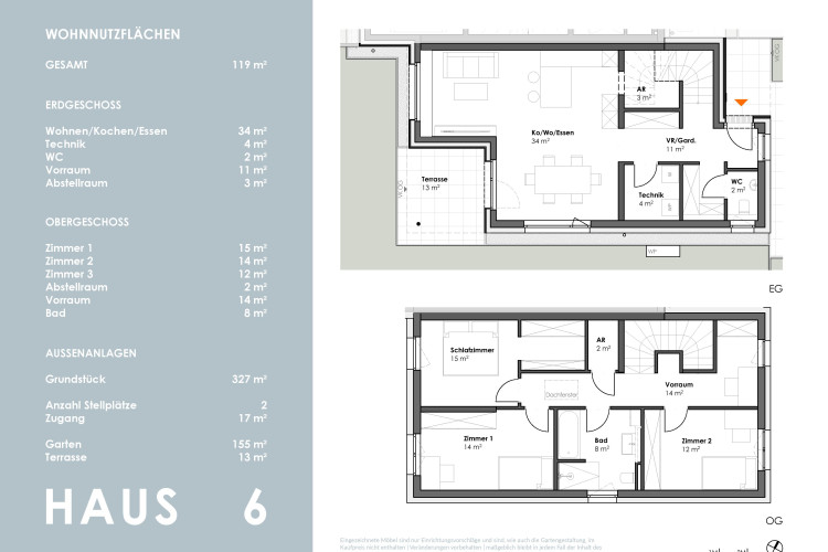Die kompakt geplanten Häuser erstrecken sich über 2 Geschosse und bieten auf ca. 102 m² - im Mittelhaus - sowie 119 m² Wohnfläche viel Platz für die ganze Familie.