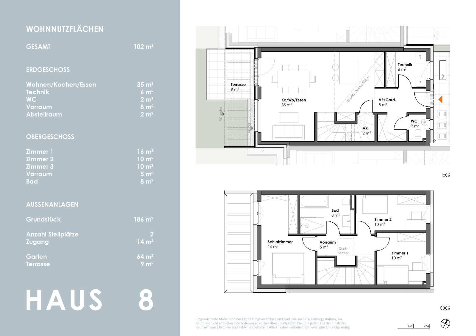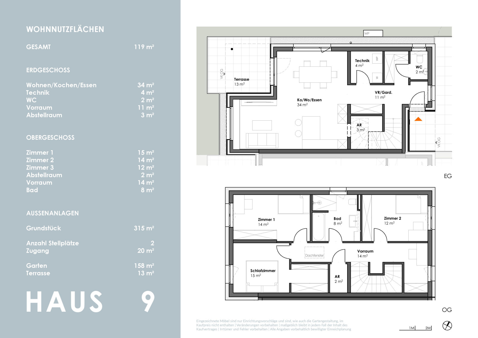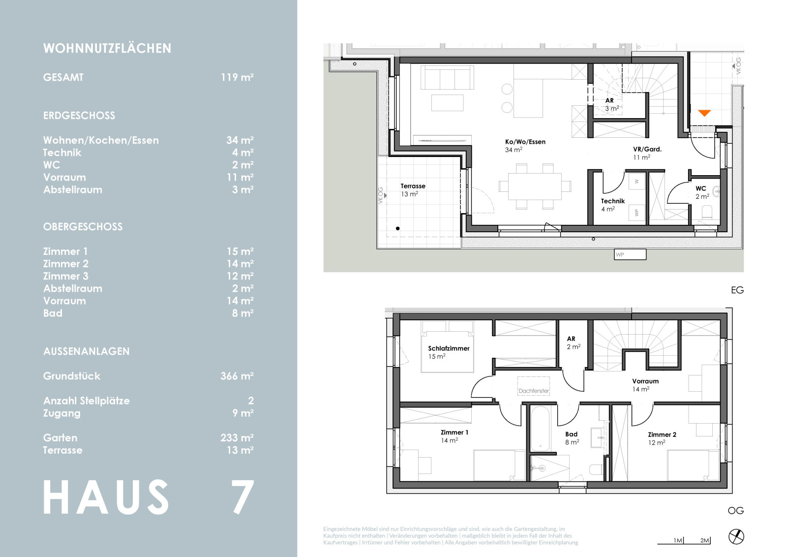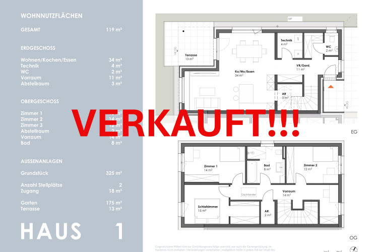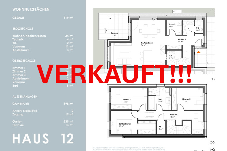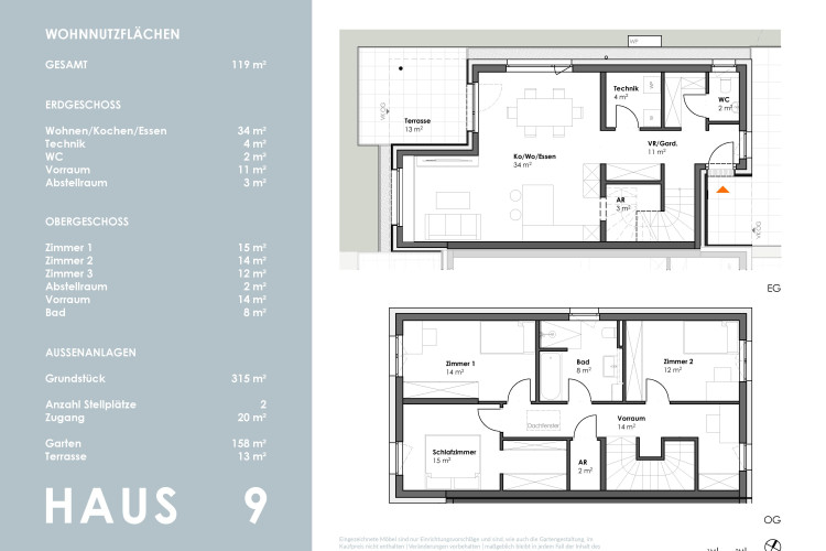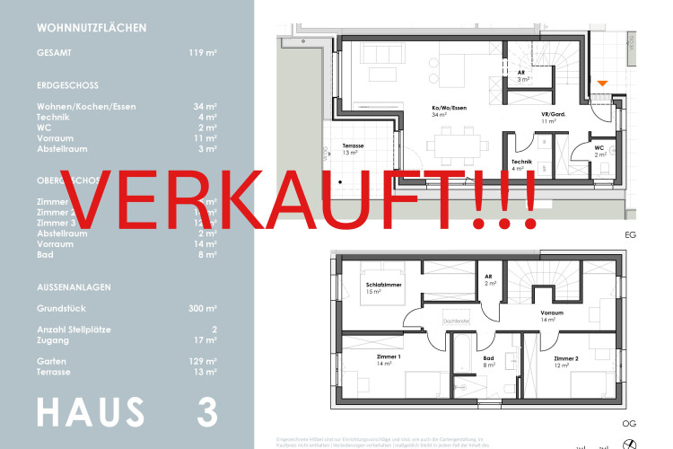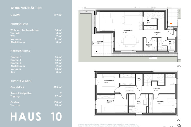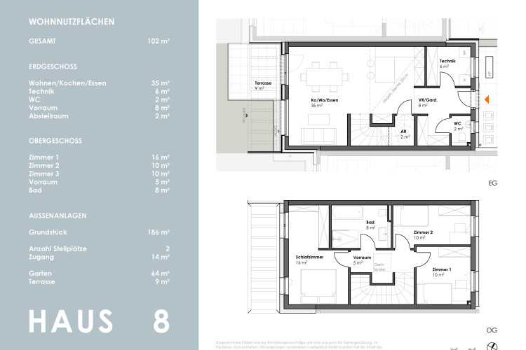 Die kompakt geplanten Häuser erstrecken sich über 2 Geschosse und bieten auf ca. 102 m² - im Mittelhaus - sowie 119 m² Wohnfläche viel Platz für die ganze Familie.